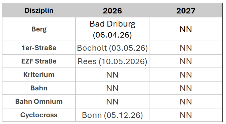 Hiermit veröffentlichen wir den aktuellen Stand (März 2026) der Termine/Orte der NRW Meisterschaften Straße/Bahn/Cyclocross: